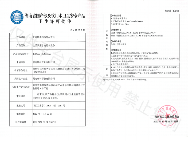 涉及飲用水衛(wèi)生安全許可批件
