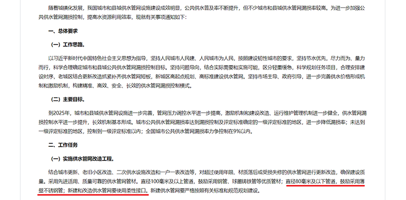 今年年初,住建部、國家發(fā)改委下發(fā)《關(guān)于加強(qiáng)公共飲水管網(wǎng)漏損控制的通知》。通知中再次提出:實(shí)施供水管網(wǎng)改造工程,直徑80毫米及以下管道,鼓勵(lì)采用薄壁不銹管。