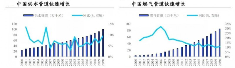 根據(jù)住建部等三部委2022年1月3日下發(fā)的《關(guān)于進(jìn)一步明確城鎮(zhèn)老舊小區(qū)改造工作要求的通知》,城鎮(zhèn)老舊小區(qū)改造應(yīng)“將老舊小區(qū)需改造的水電氣熱信等配套設(shè)施優(yōu)先納入本單位專(zhuān)營(yíng)設(shè)施年度更新改造計(jì)劃”,且“將存在安全隱患的排水、燃?xì)獾壤吓f管線……作為重點(diǎn)內(nèi)容優(yōu)先列為改造內(nèi)容”。我們認(rèn)為文件進(jìn)一步確認(rèn)了老舊燃?xì)夤艿栏碌钠惹行?,在此背景下,我們預(yù)期我國(guó)將迎來(lái)城市老化管道集中更新,燃?xì)?、給排水管道需求有望超預(yù)期集中爆發(fā)。